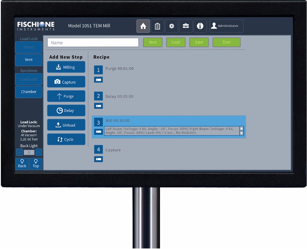 TEM Mill оснащён вакуумным загрузочным шлюзом для быстрой замены образца. Шлюз эргономично спроектирован: просто поднимите крышку, чтобы загрузить держатель образца на платформу. После закрытия крышки вакуум обеспечивает её фиксацию во время ионного травления. Электронно управляемый подъёмник перемещает образец в позицию травления. По завершении процесса держатель возвращается в загрузочный шлюз и остаётся под вакуумом до момента вентиляции пользователем. Вентиляция занимает всего несколько секунд, после чего образец можно быстро перенести в держатель TEM, минимизируя риск загрязнения окружающей средой.